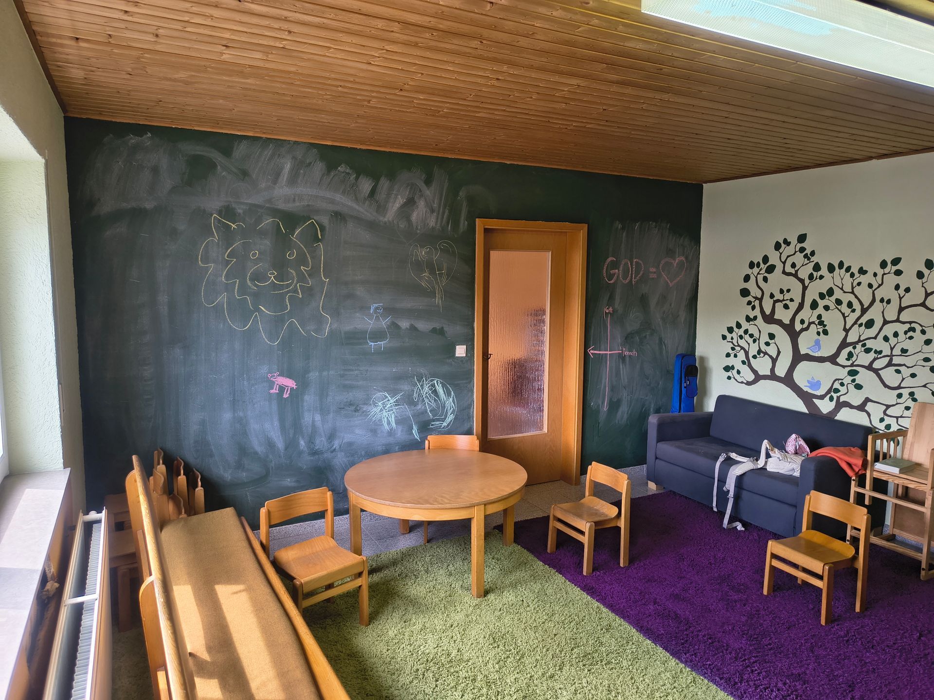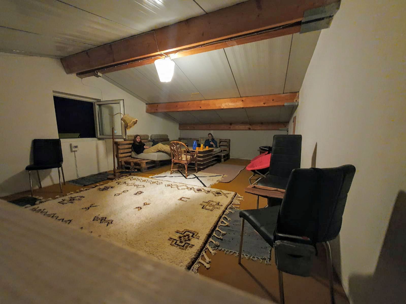 auf dem Dachboden der Gemeinderäume. Dort haben wir einen gemütlichen Raum, der Platz für Gespräche, gemeinsames Lernen und Zusammensein bietet.